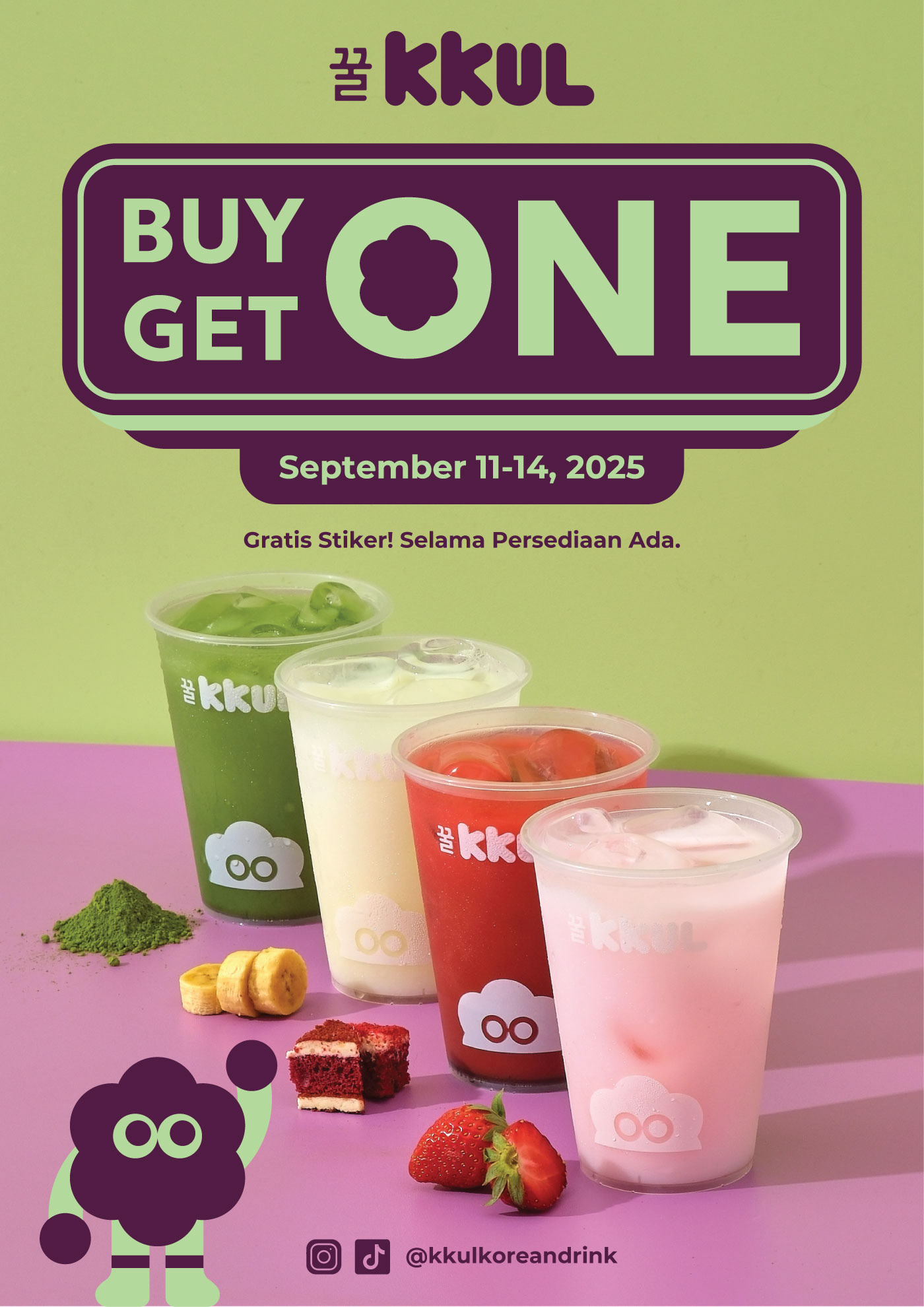 KKUL is all about being modern and super fun, which is perfect for a Korean-inspired drinks spot that's on a cool, modern cart. We're keeping the logo simple and friendly so it's easy to spot and read. The real star, though, is LUKK the mascot, a fluffy purple creature which totally unique and gives the brand a ton of personality. You'll see that little guy everywhere, from the back of the t-shirts to the cart itself. The colors are this awesome mix of a dark purple and a bright lime green, which makes everything pop and gives a hint of those sweet, fruity flavors. Basically, the design is clean but has a lot of personality, making KKUL feel really chill and approachable.